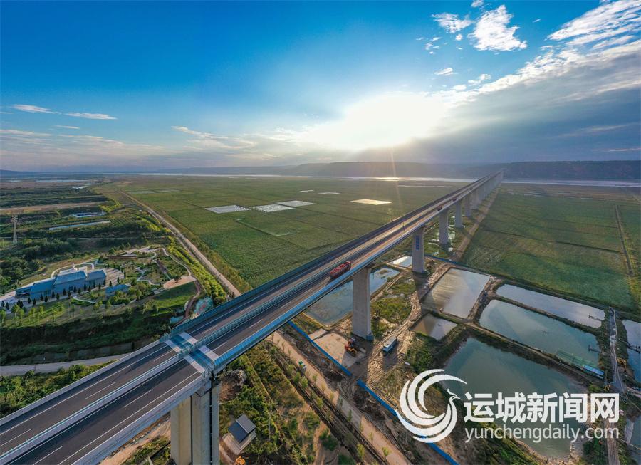 菏宝高速临猗黄河大桥如虹,跨过奔流的黄河,与万亩荷塘、绿色河滩相互映衬,绘就一幅黄河流域高质量发展新画卷。