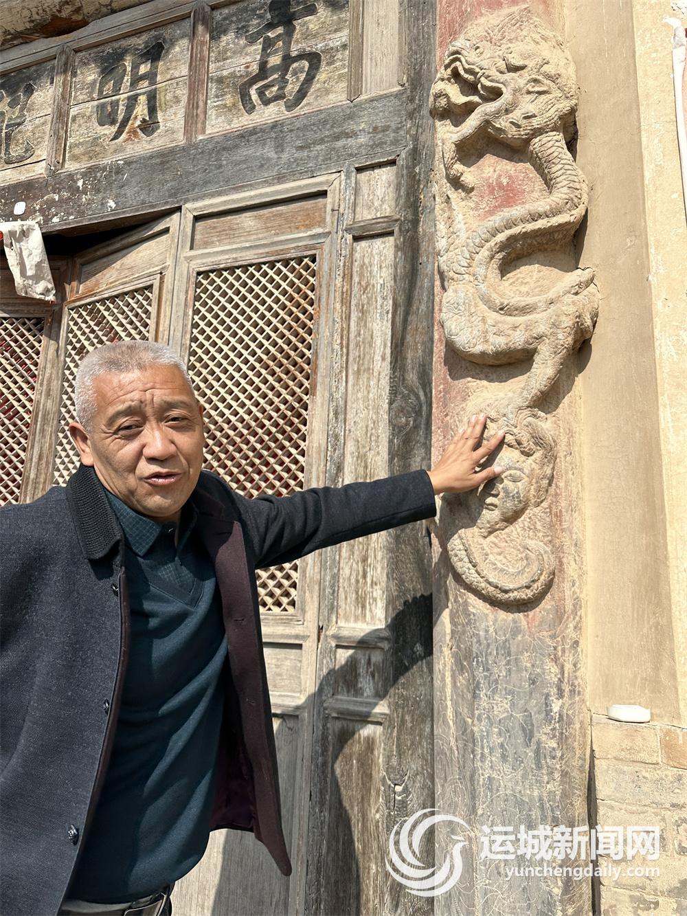 最令人称奇的,是殿门前两侧的那对八棱石雕螭龙柱。“五爪为龙,四爪为蟒,三爪为蛟,你看这柱上的,正是五爪龙。”王渺狮指着龙柱介绍,这是明代重修时更换的构件,柱顶上还留有依稀可辨的刻字,记载其由正德年间解州夏县人士捐赠,“由此也能看出,当年这庙在方圆一带十分有名,规模宏大”。