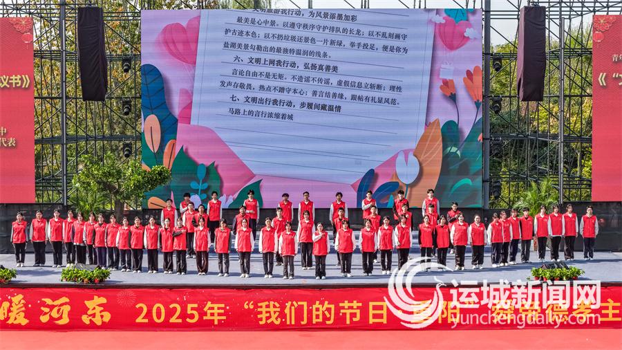 歌伴舞《我们的生活充满阳光》奏响幸福旋律,诗朗诵《德孝咏流传》追溯舜帝德孝文化与盐湖的历史渊源;少儿合唱《唱给爷爷的歌》用童声传递家风力量,情景表演《母亲》诠释女性在家庭建设中的奉献担当;青年代表发布的《“文明同行 新风盐湖”倡议书》,更将这份传承转化为当代青年的行动自觉。