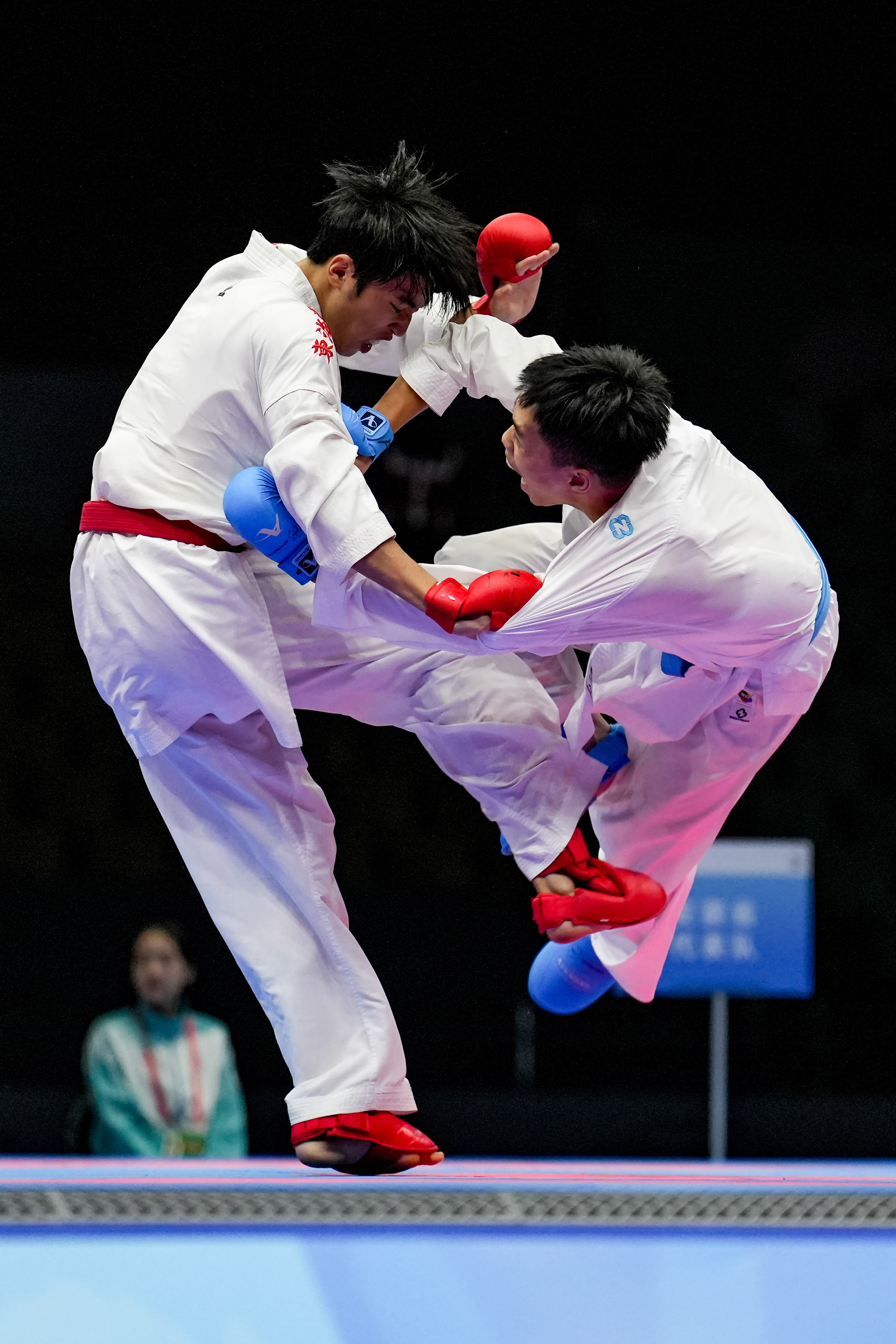 当日,第十五届全国运动会群众比赛空手道男子个人67公斤级决赛在澳门举行,澳门队选手容君灏战胜安徽队选手耿旭,夺得冠军。