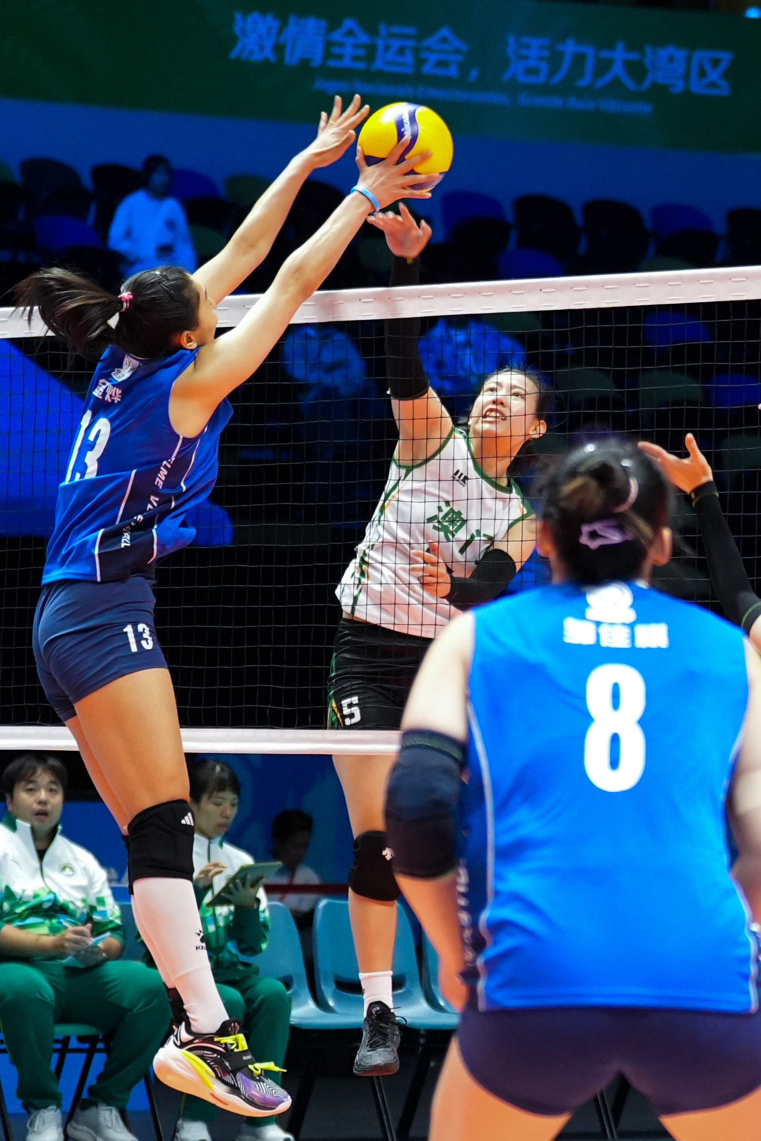 当日,在澳门举行的第十五届全国运动会排球女子成年组小组赛A组比赛中,北京队3比0战胜澳门队。 新华社发