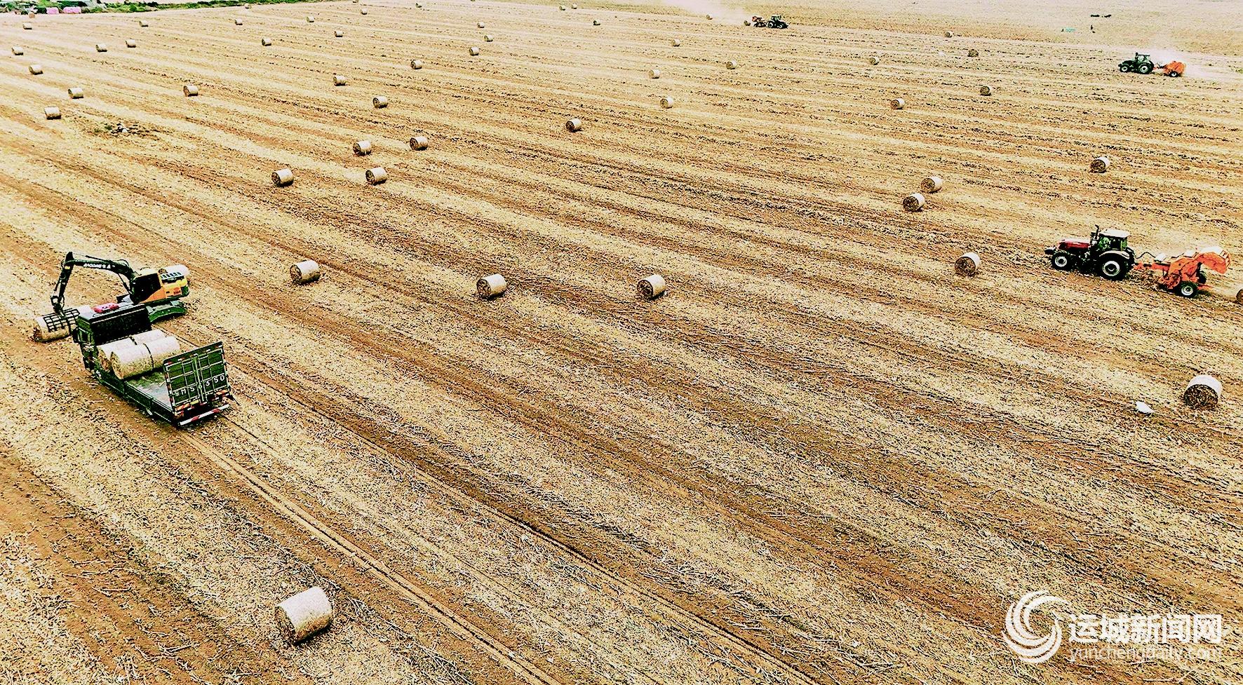 万荣县黄河滩地上,种植户正忙着实施玉米秸秆打捆与装车运输作业。