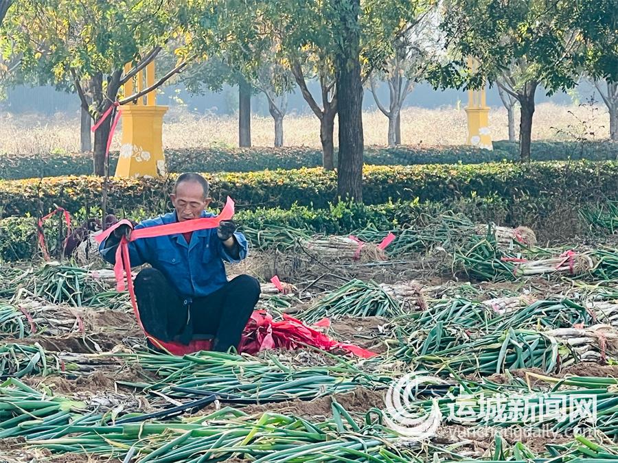 11月11日,万荣县解店镇七庄村村民在收获大葱。