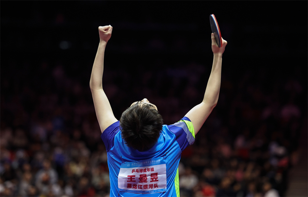 11月16日,黑龙江队选手王曼昱庆祝获胜。当日,在澳门举行的第十五届全国运动会乒乓球女子单打金牌赛中,黑龙江队选手王曼昱4比2战胜河北队选手孙颖莎,获得金牌。 新华社记者 陈斌 摄