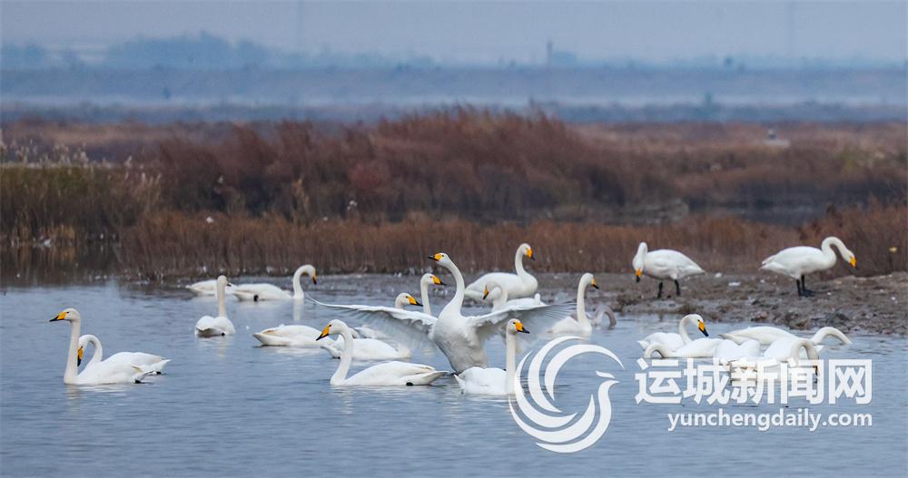 初冬时节,大批远道而来的野生大天鹅飞抵运城盐湖,在此栖息越冬。