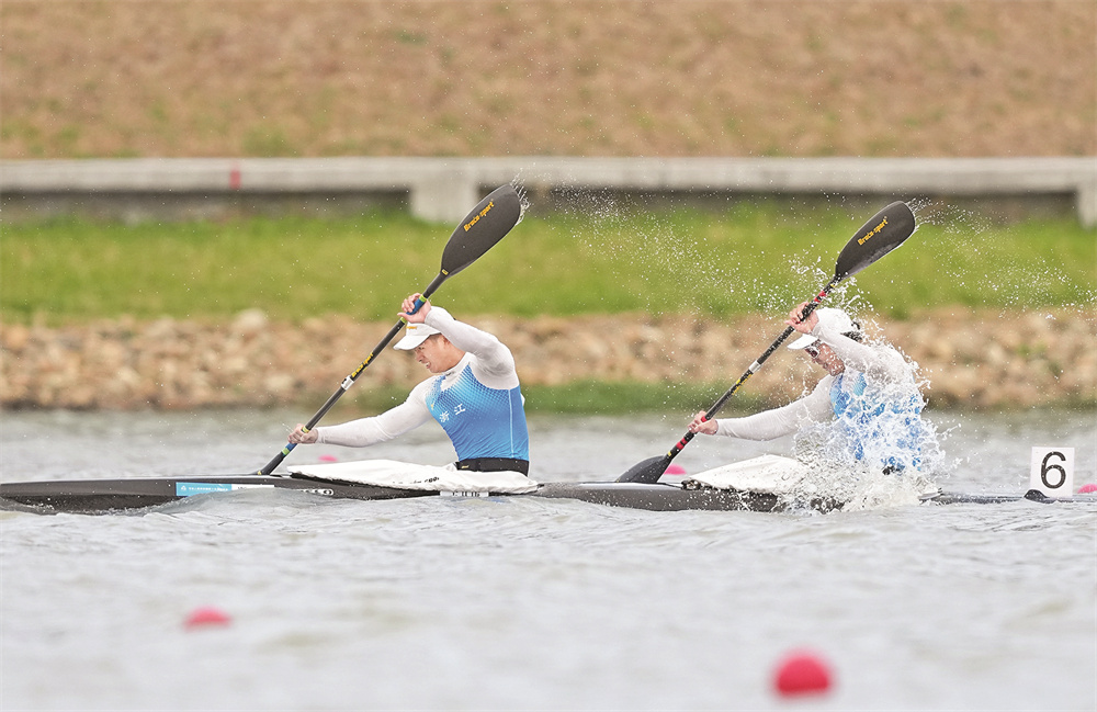 11月19日,浙江队组合王丛康(左)/徐佳炜在比赛中。最终,他们获得冠军。当日,第十五届全国运动会皮划艇静水项目男子500米双人皮艇决赛在广州举行。