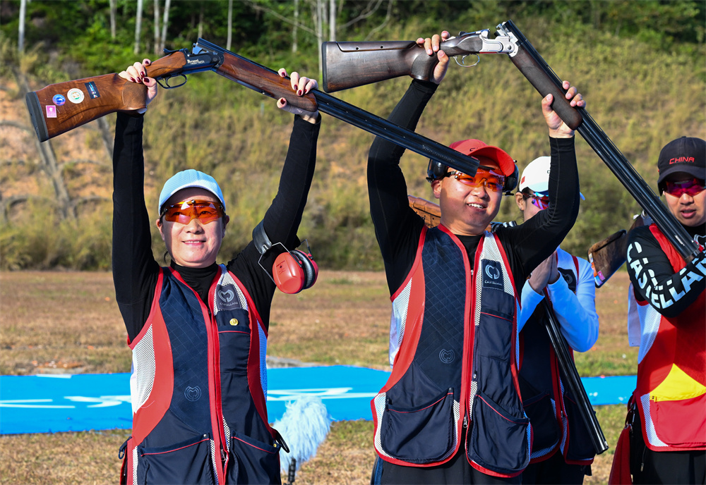 11月20日,湖南队组合郭雨浩、刘英姿在比赛后庆祝。当日,第十五届全国运动会射击项目飞碟多向混合团体金牌赛在广州举行。郭雨浩/刘英姿击败陕西队组合获得冠军。 新华社记者 肖恩楠 摄