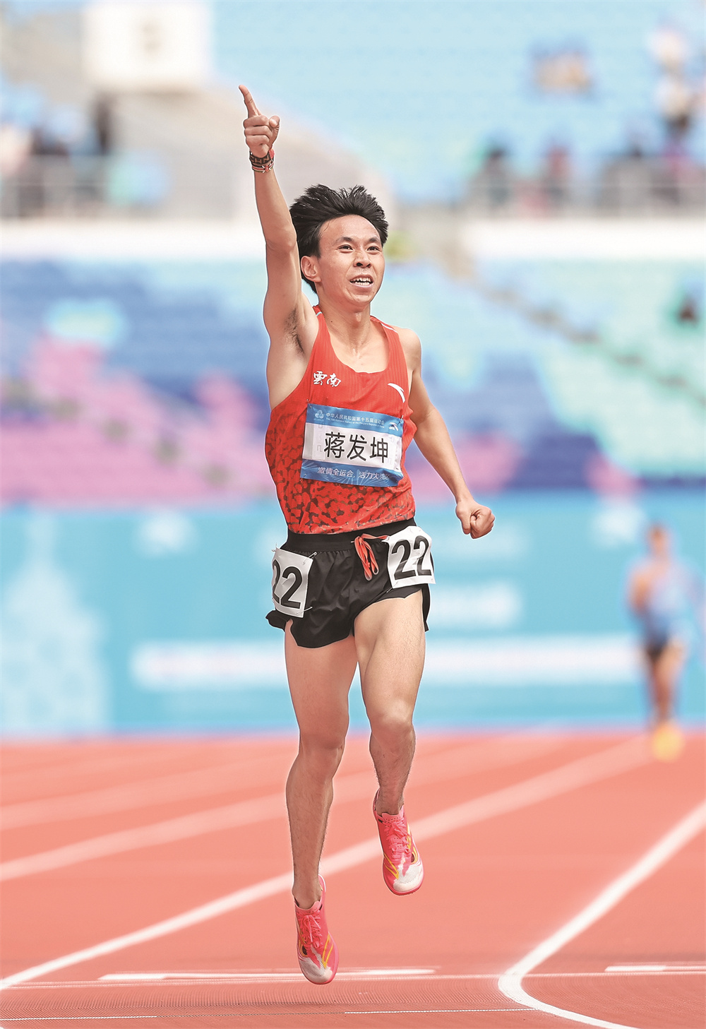 11月20日,云南队选手蒋发坤冲过终点后庆祝。最终,他夺得冠军。当日,第十五届全国运动会田径男子10000米决赛在广州举行。