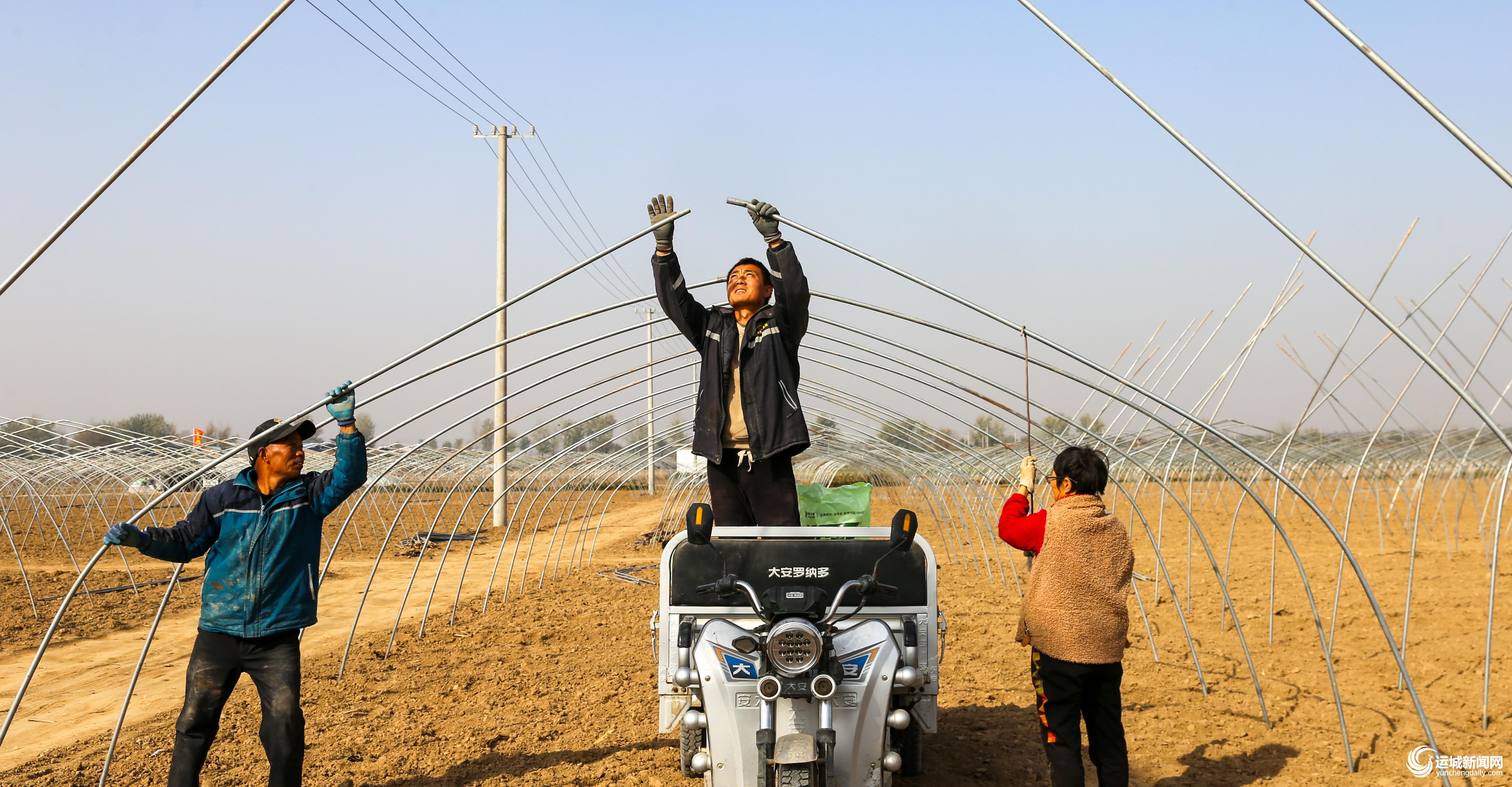 11月23日,夏县祁家河乡西北庄村村民在搭建西瓜大棚,为明年早春西瓜秧苗移栽进棚作准备。