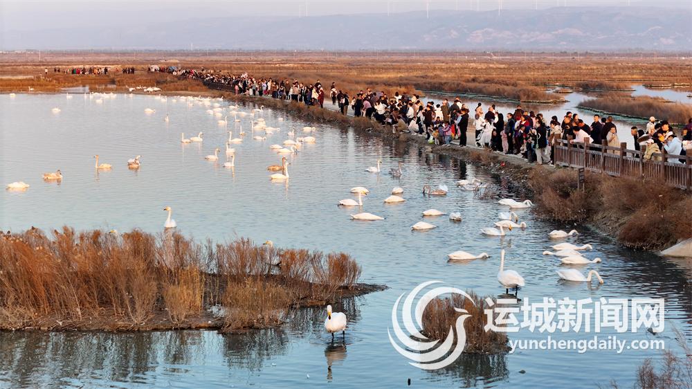 随着盐湖生态的持续改善,大量的天鹅选择在此越冬。周末闲暇时,市民们纷纷前往运城盐湖观赏天鹅。
