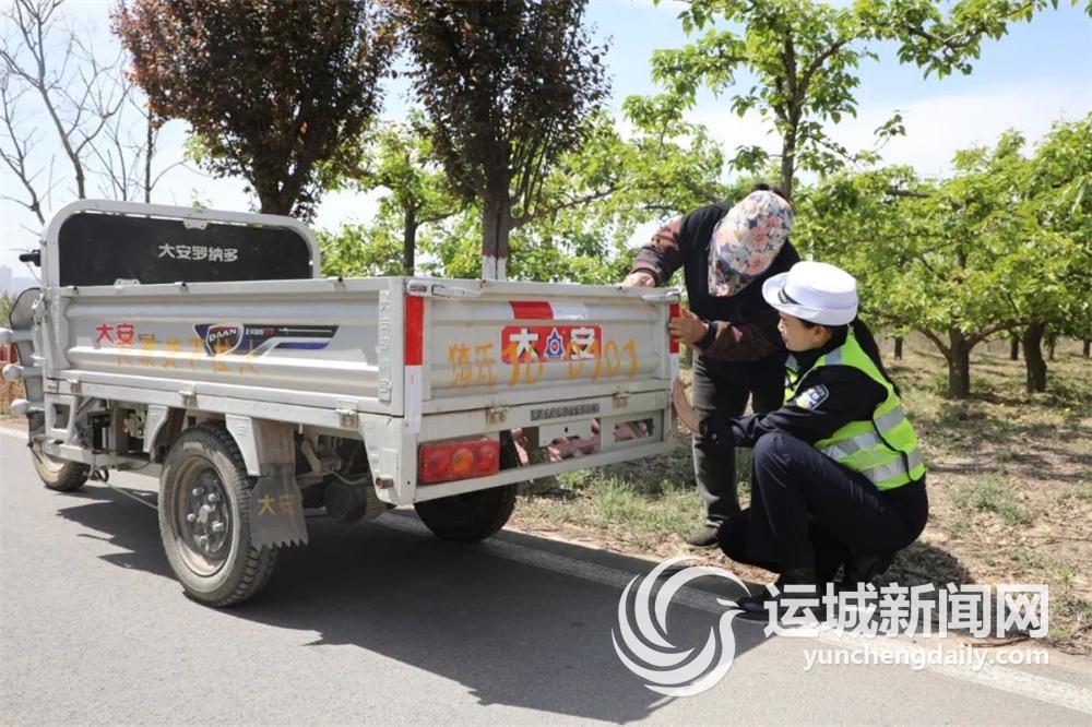 在临猗县孙吉镇的村道上,临猗县公安局交管大队民辅警正弯腰为一辆三轮车张贴反光条,车尾新喷的编码在阳光下格外醒目。