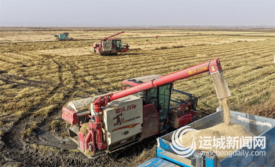 11月27日,万荣县荣河镇黄河滩涂上,农户驾驶收割机收割水稻。