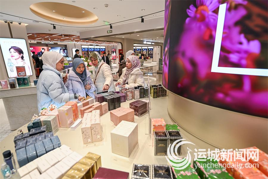 11月26日,来自马来西亚的游客在西安市内免税店免税商品区选购香水。