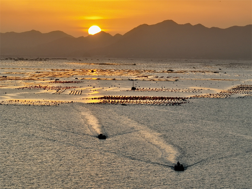11月28日,福建省宁德市霞浦县海上养殖区两艘渔船在日落时分返港(无人机照片)。