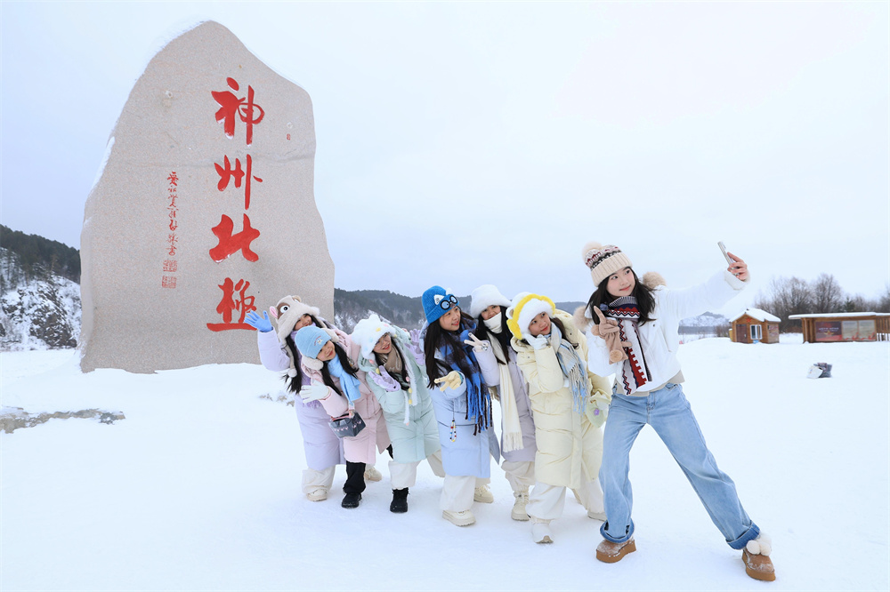 近日,有着“神州北极”之称的黑龙江省漠河市冰雪旅游持续升温,这是游客在漠河北极村“神州北极”碑前打卡拍照。