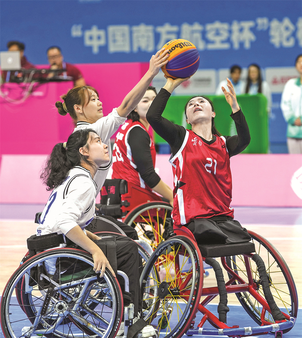 当日,在全国第十二届残疾人运动会暨第九届特殊奥林匹克运动会轮椅篮球项目女子三人篮球小组赛中,云南队18比4战胜浙江队。 新华社记者 高咏薇 摄