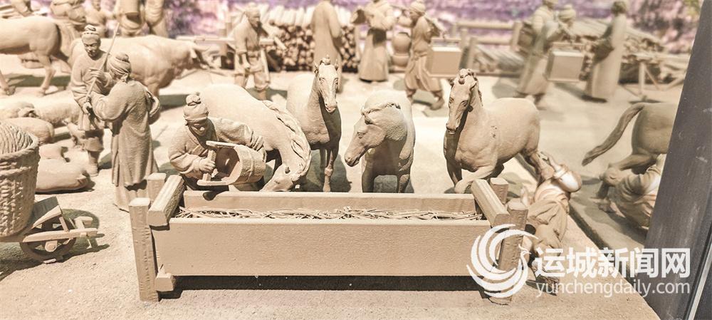 临猗县博物馆“商祖猗顿”展区“古人往饮马槽倒水、放置草料喂马”泥塑 记者 刘亚 摄