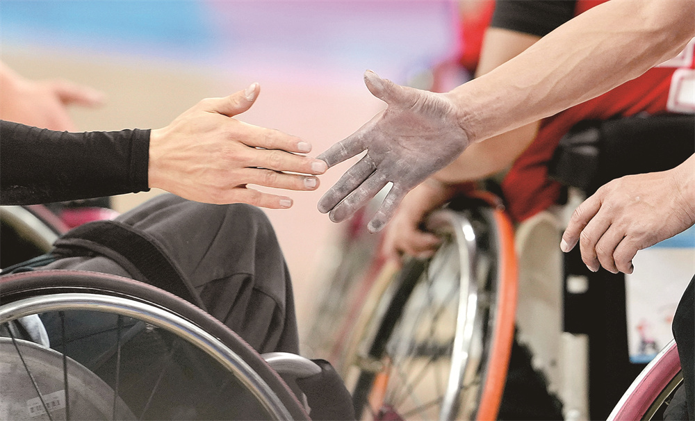 12月9日,西藏队球员旦增(右)在赛后向对手致意。当日,在广州举行的全国第十二届残疾人运动会暨第九届特殊奥林匹克运动会轮椅篮球项目男子组小组赛中,辽宁队75比31战胜西藏队。 新华社记者 吴鲁 摄