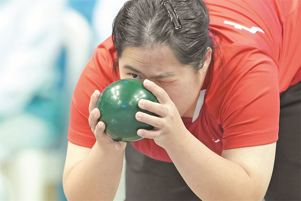 12月9日,广西队选手邓金汭在比赛中。最终,她和搭档黄一霖获得E组第二名。当日,全国第十二届残疾人运动会暨第九届特殊奥林匹克运动会特奥滚球项目女子双打决赛12岁~21岁组在广东中山举行。新华社记者 杨晨光 摄