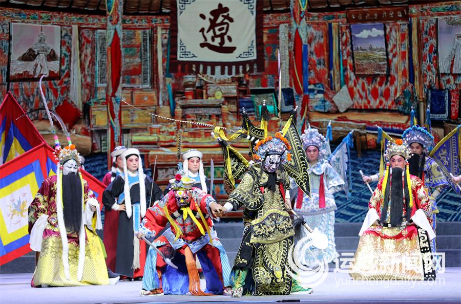 传统历史剧《双龙会》则以宋辽对峙为背景,铺展杨家将的悲壮史诗:辽邦勾结奸臣潘仁美设下议和陷阱,诱捕宋太宗;老将杨继业识破阴谋却遭贬黜,佘太君临危献策命杨五郎护驾幽州;太宗中计被困后,杨家八子驰援金沙滩,大郎扮帝赴约、以身破局,最终四子阵亡、二子失散,仅剩二子生还。金沙滩之战中,刀光剑影交错,演员们以复杂的身段和凌厉的招式,再现战场上的生死搏杀,紧凑的武打设计、考究的服饰造型,搭配雄浑的蒲剧唱腔,营造出金戈铁马的历史氛围,令观众沉浸式感受杨家将的家国大义。