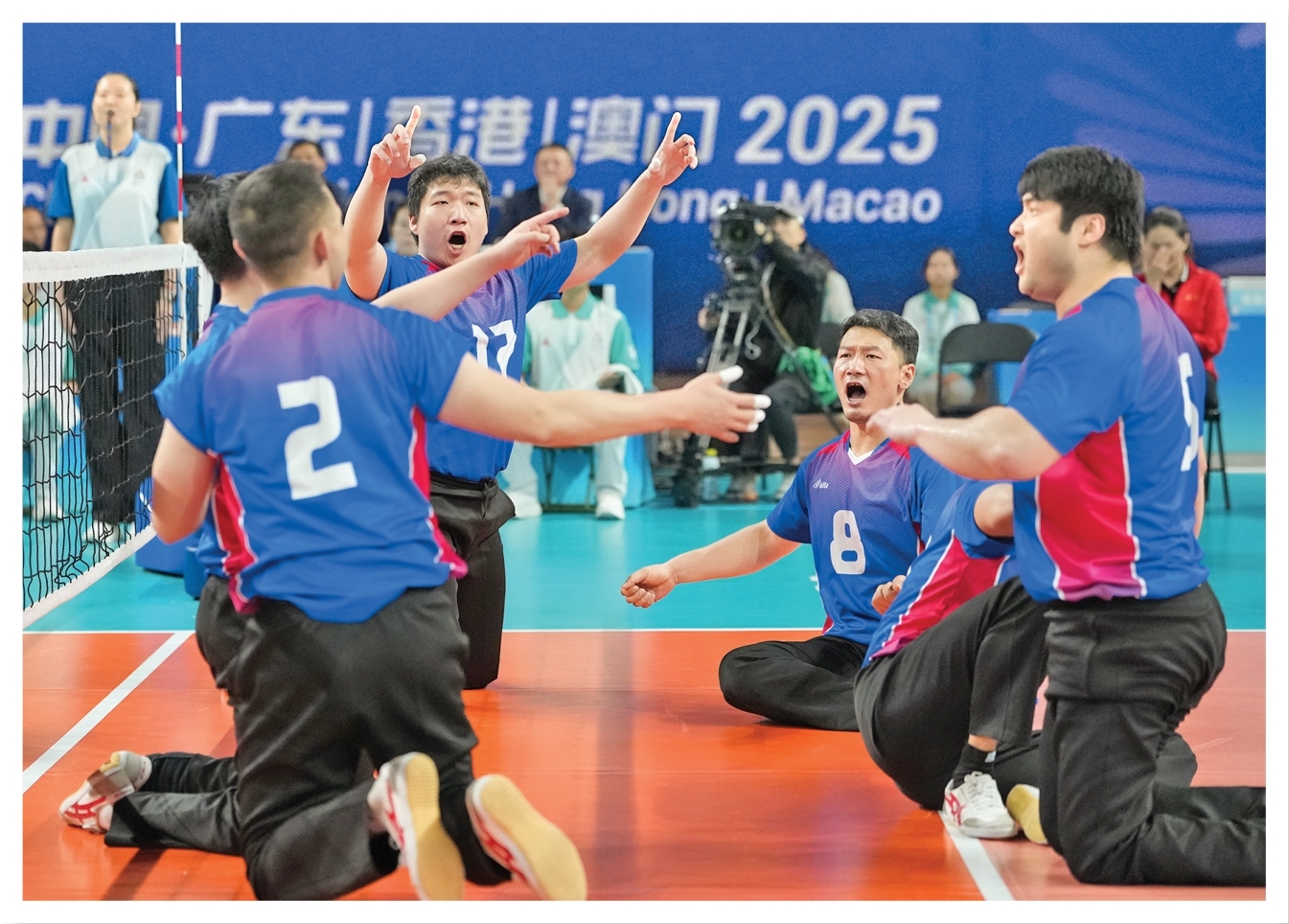 12月14日,上海队球员在比赛中庆祝得分。当日,在坐式排球项目男子组铜牌赛中,上海队3比0战胜江苏队,获得铜牌。