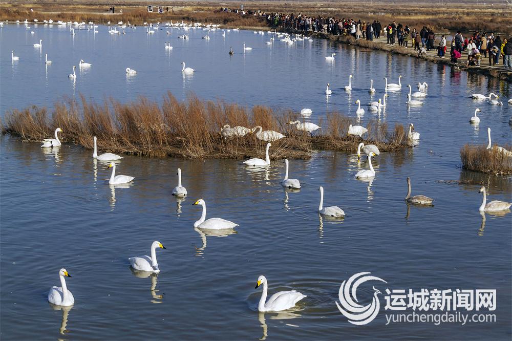 这些飞抵运城盐湖湿地越冬的天鹅,时而嬉戏、时而飞翔、时而觅食,吸引众多游客前来观赏游玩,成为千年盐湖一道人与自然和谐共生的美丽风景线。
