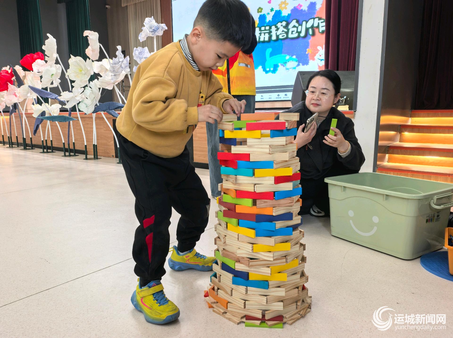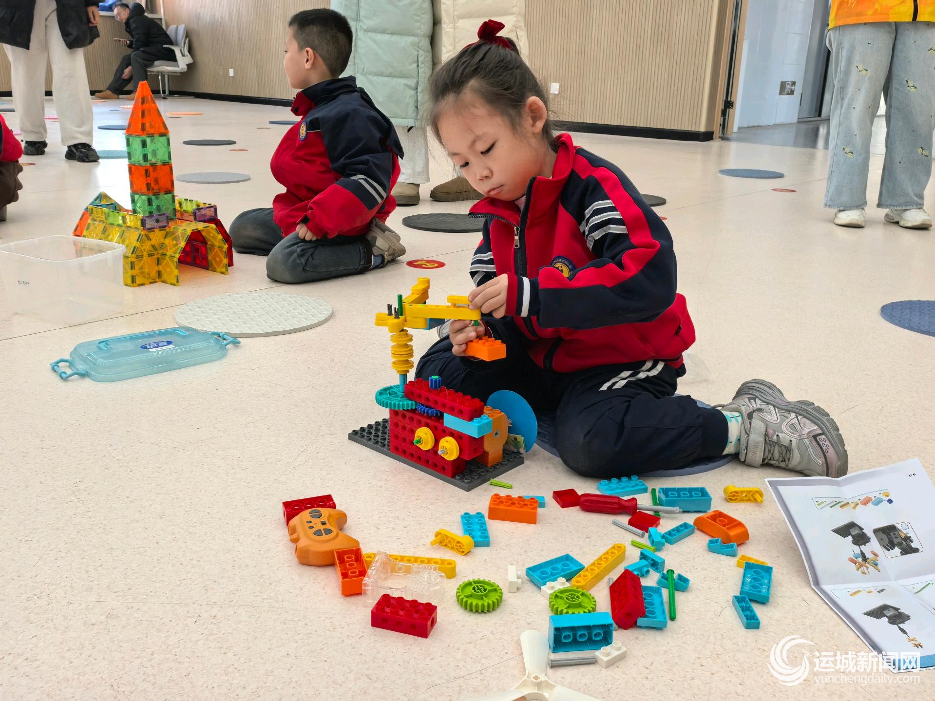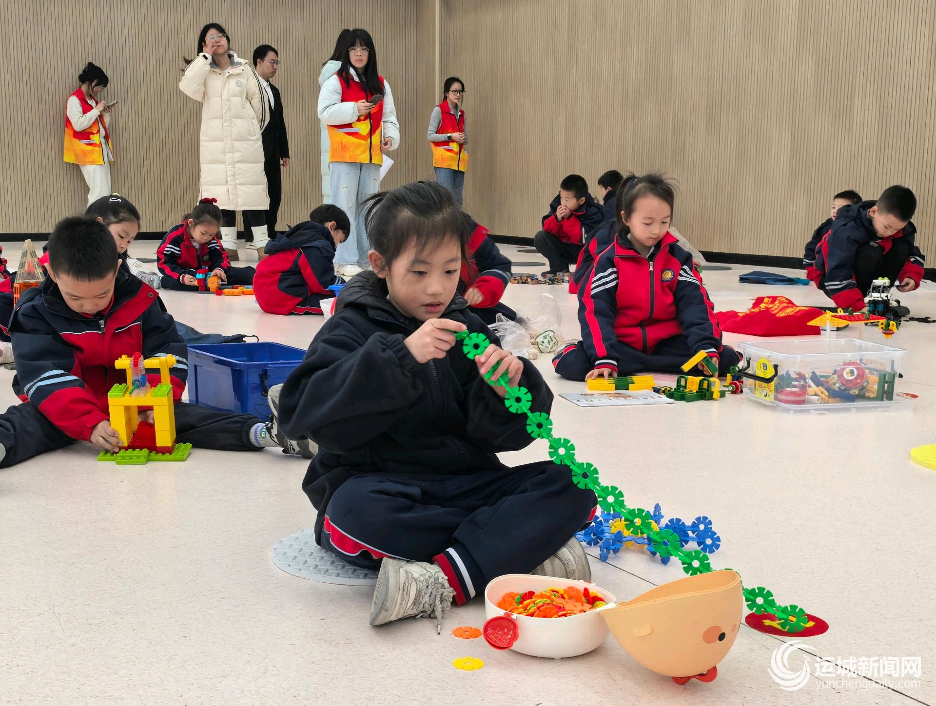 12月5日上午,在盐湖区涑水联合双语学校,60余名一年级学生正在参加校园第二届建构大赛,利用建构零件现场组装,展现创意和动手能力。