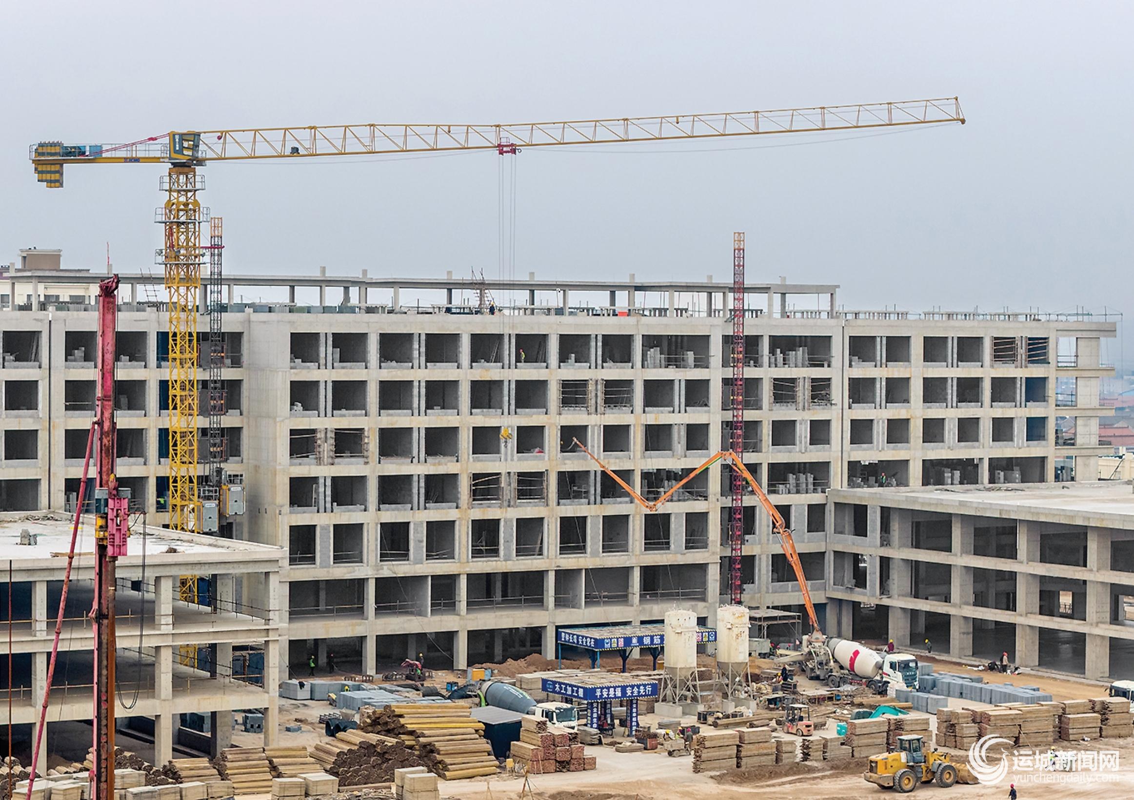 近日,在万荣县希尔顿花园酒店项目施工现场,工人在加紧施工。