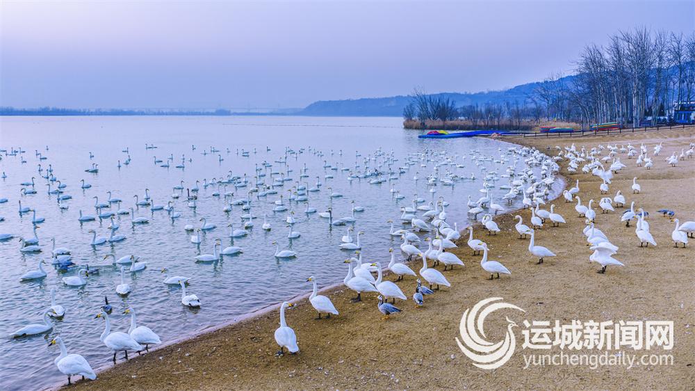 近日,芮城县圣天湖景区,成群的大天鹅在波光粼粼的湖面上游弋嬉戏,成为冬日黄河岸畔一道亮丽的风景线。特约摄影 杨建峰 摄