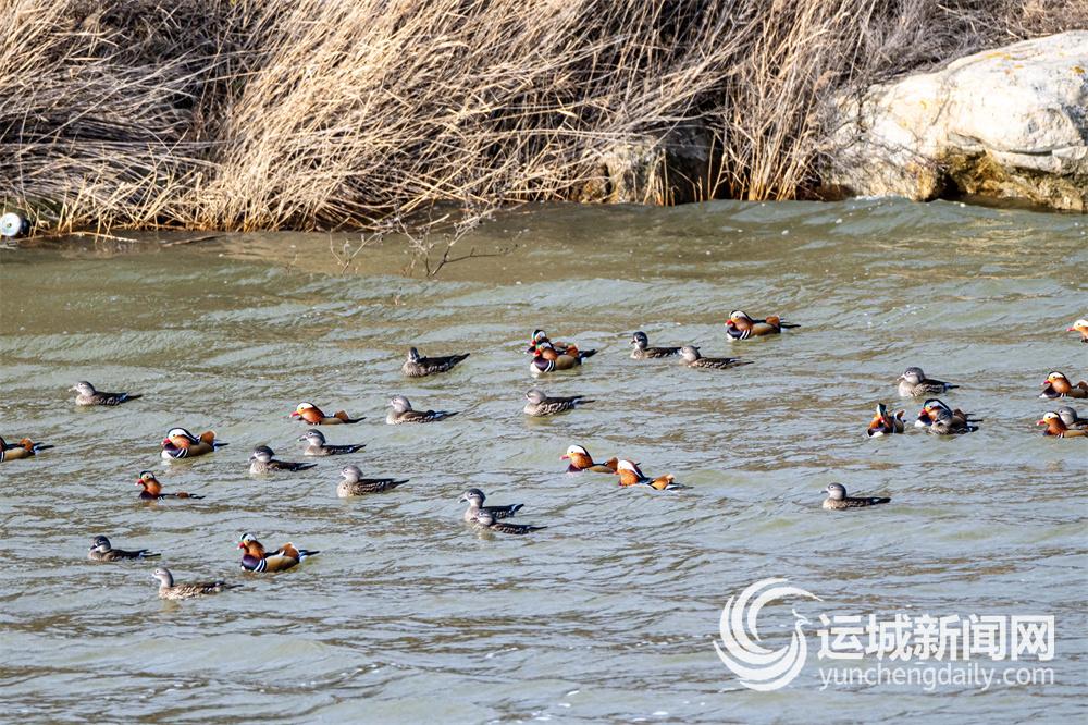 冬至刚过,气温骤降。闻喜酒务头水库迎来上百只来此越冬的野生鸳鸯,它们时而在水里低头觅食,时而追逐嬉戏,成为冬日水库一道亮丽的风景线。 特约摄影 党永立 摄