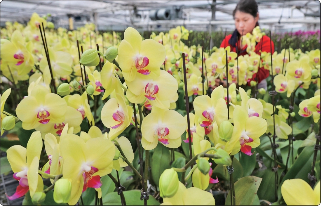 12月23日,在江苏省连云港市农商控股集团农业科技公司花卉大棚,工作人员在管护蝴蝶兰。