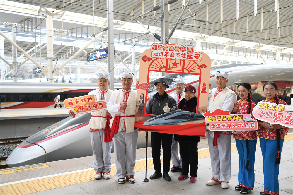 12月26日,乘坐西延高铁首发列车的乘客与演员在延安站站台合影留念。当日,西安至延安高速铁路正式开通运营,革命圣地延安迈入“高铁时代”。