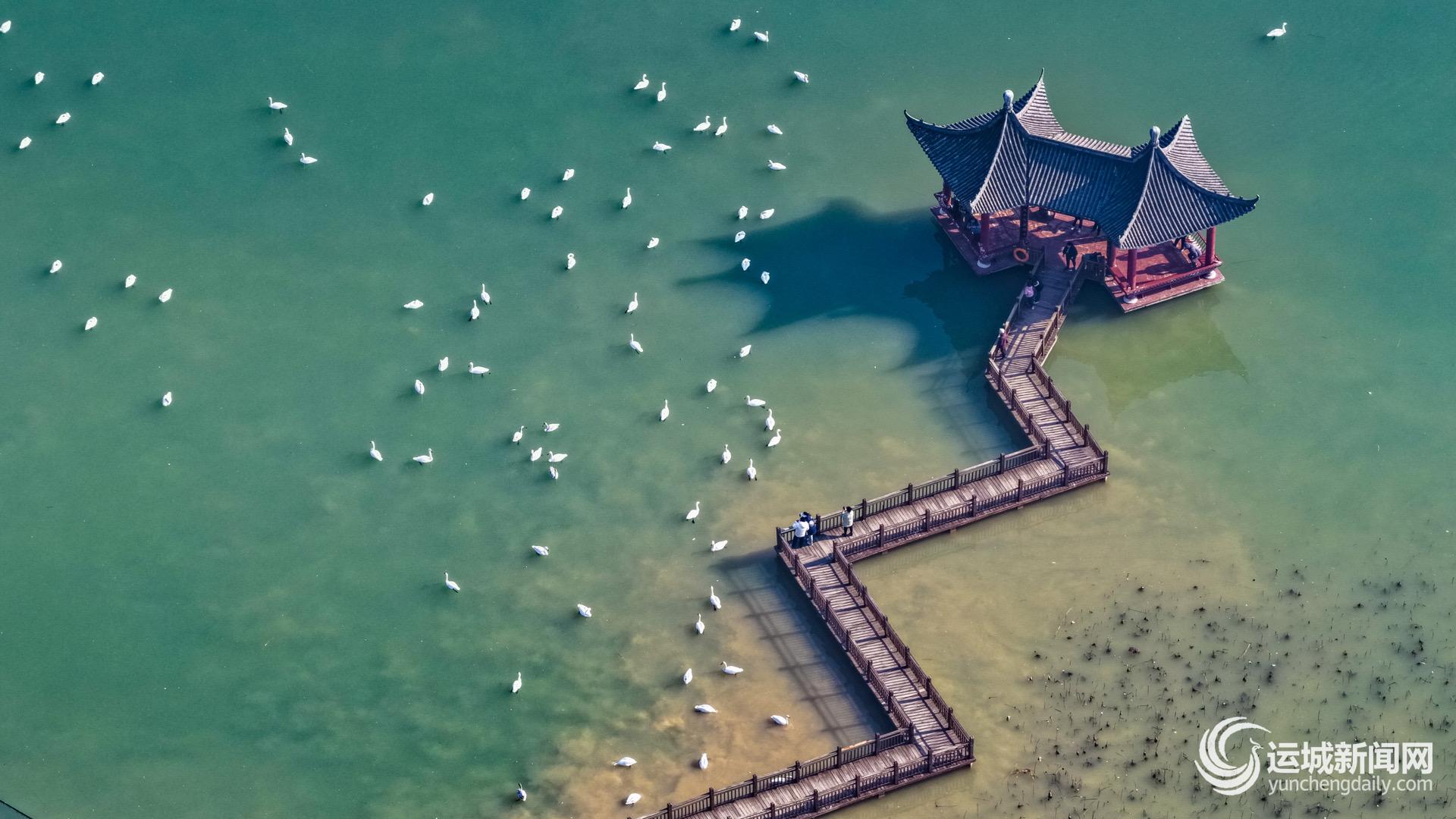 12月27日,芮城县圣天湖景区内,千余只越冬大天鹅在湖面游弋觅食,与岸边驻足的市民构成一幅人鸟相谐的冬日画卷。