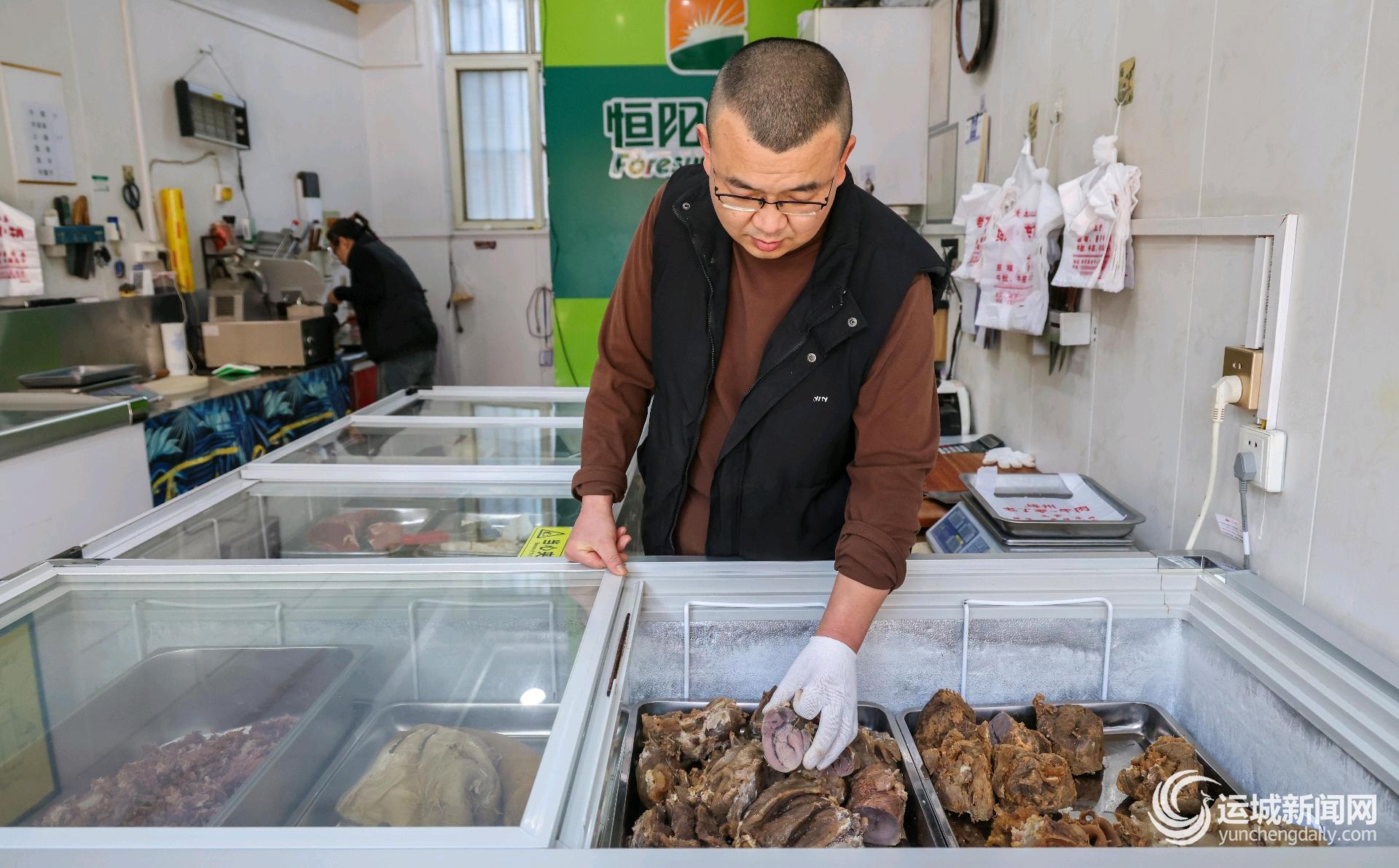 走进盐湖区一家名为“袁师牛肉馆”的老店,浓郁的卤香扑面而来。玻璃柜台内,熟牛肉、肉丸子、牛筋、牛肚等整齐排列,色泽红润,纹理分明。