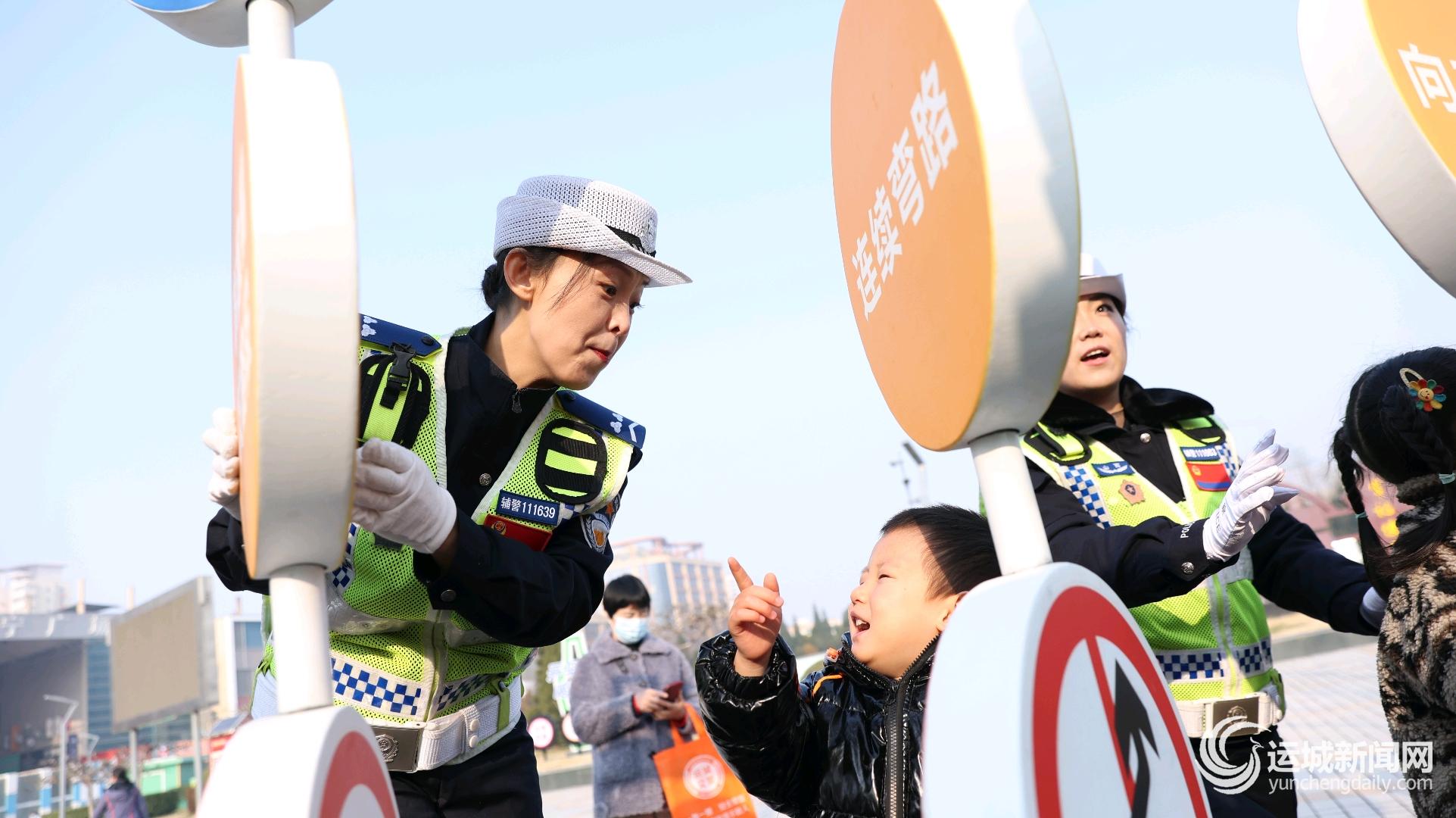 民警在交通安全主题公园与小朋友互动。