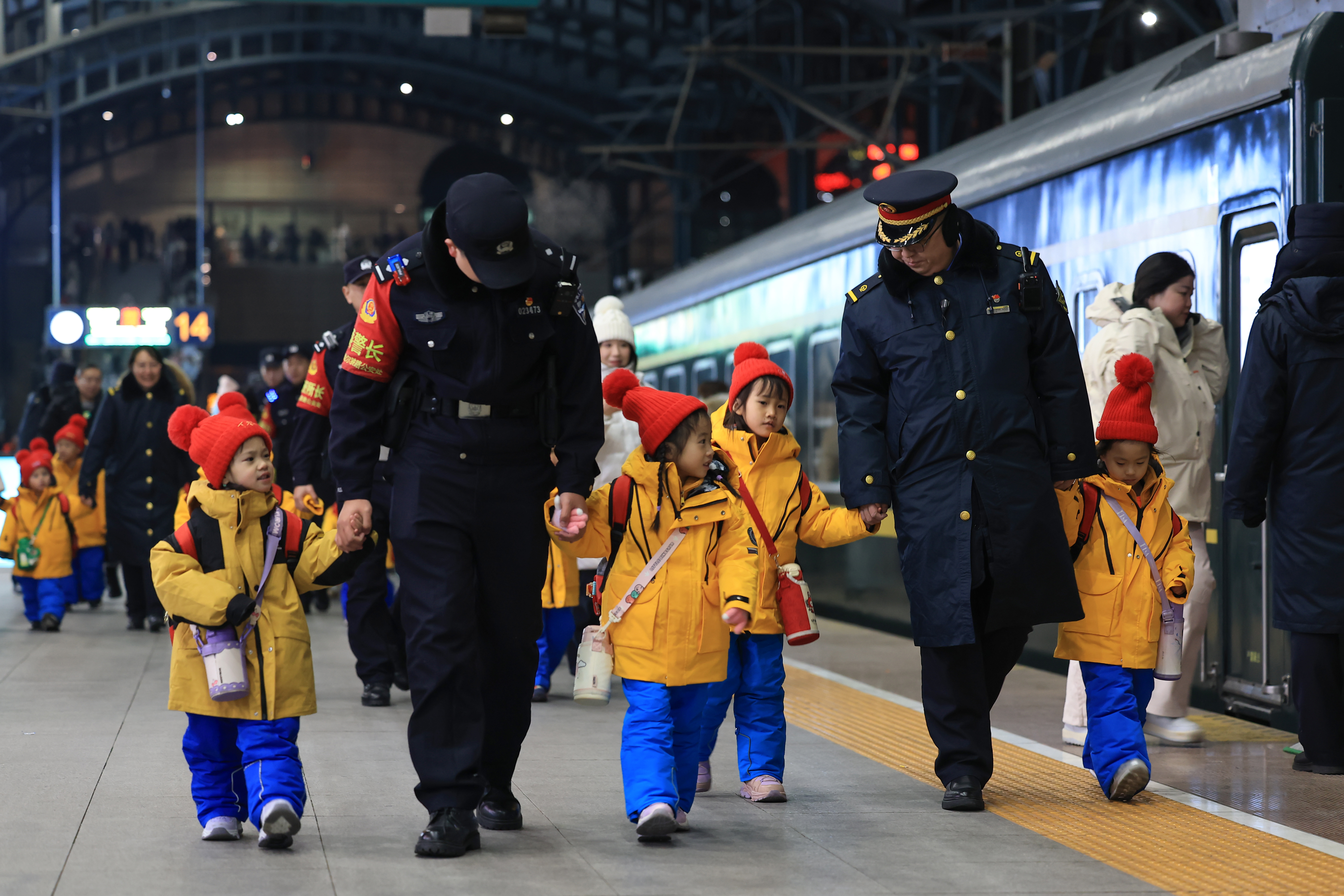 2025年12月30日,K7041次列车工作人员在哈尔滨站引导来自广西的小朋友登车。