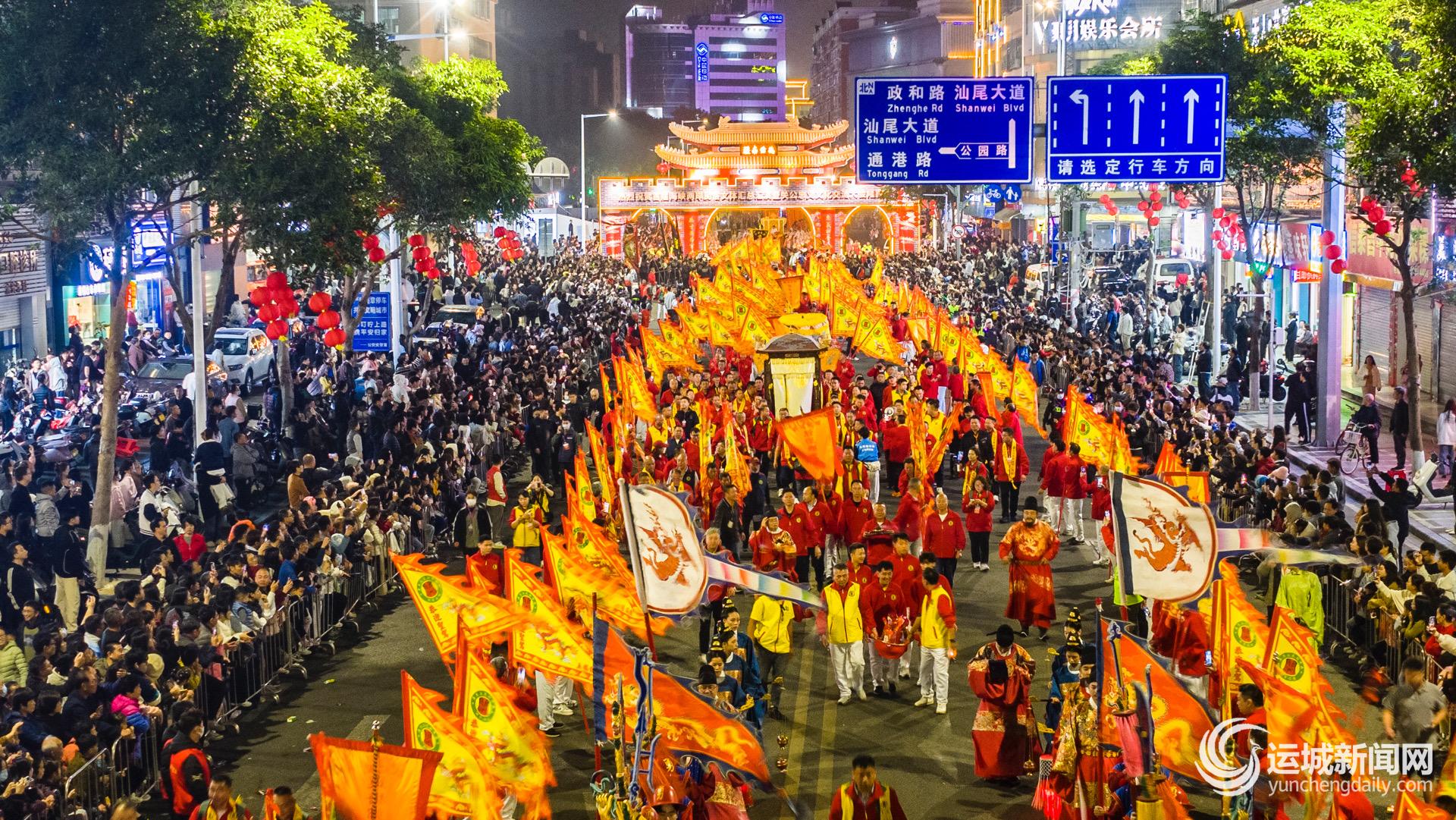 2025年12月21日,“关帝圣像”抵达首站广东汕尾,恰逢首届海峡两岸民俗文体汇总汇演暨关公忠义文化交流大会举行。作为活动“压轴华章”,一场以“同文同俗·两岸一心”为主题的大型民俗巡游在夜幕中盛大上演。巡游队伍宛如流动的文化长河:五色祥狮腾跃,龙舟花车流光,汉服方阵翩跹,节令鼓声铿锵。尤为引人注目的是,解州关帝圣像与来自台湾关庙及汕尾本地的队伍并肩同行,共同演绎“两岸一家亲”的动人篇章,直观展现了两岸同根同源的文化基因与血脉亲情。沿途“风调雨顺、国泰民安”的呼喊声响彻云霄,数万民众设香案、迎圣驾,场面热烈。
