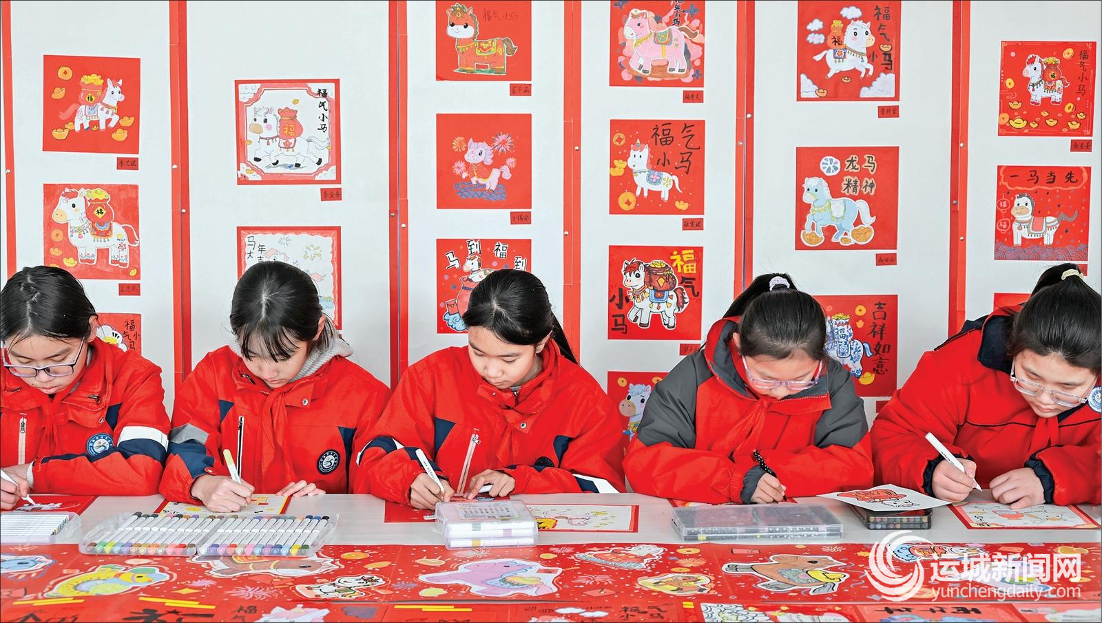 马年春节的脚步临近,该校围绕“龙马精神”这一主题开展了丰富多彩的活动,展示素质教育成果。书画社团的老师讲马、学生画马,旨在鼓励学生拿出跃马扬鞭的勇气,在德智体美劳全面发展的道路上马不停蹄,取得优良成绩。特约摄影 崔松良