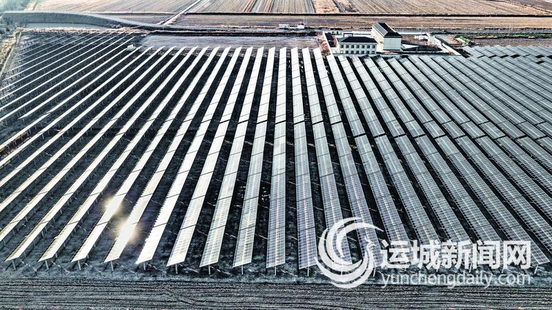 永济市城北街道东伍姓村的盐碱滩涂上,成片的光伏板在冬日的照耀下熠熠生辉(1月6日摄)。永济市近年充分利用荒山、荒滩资源,积极布局风电、光伏发电和生物质发电项目,探索形成“生态+产业”融合发展新模式。