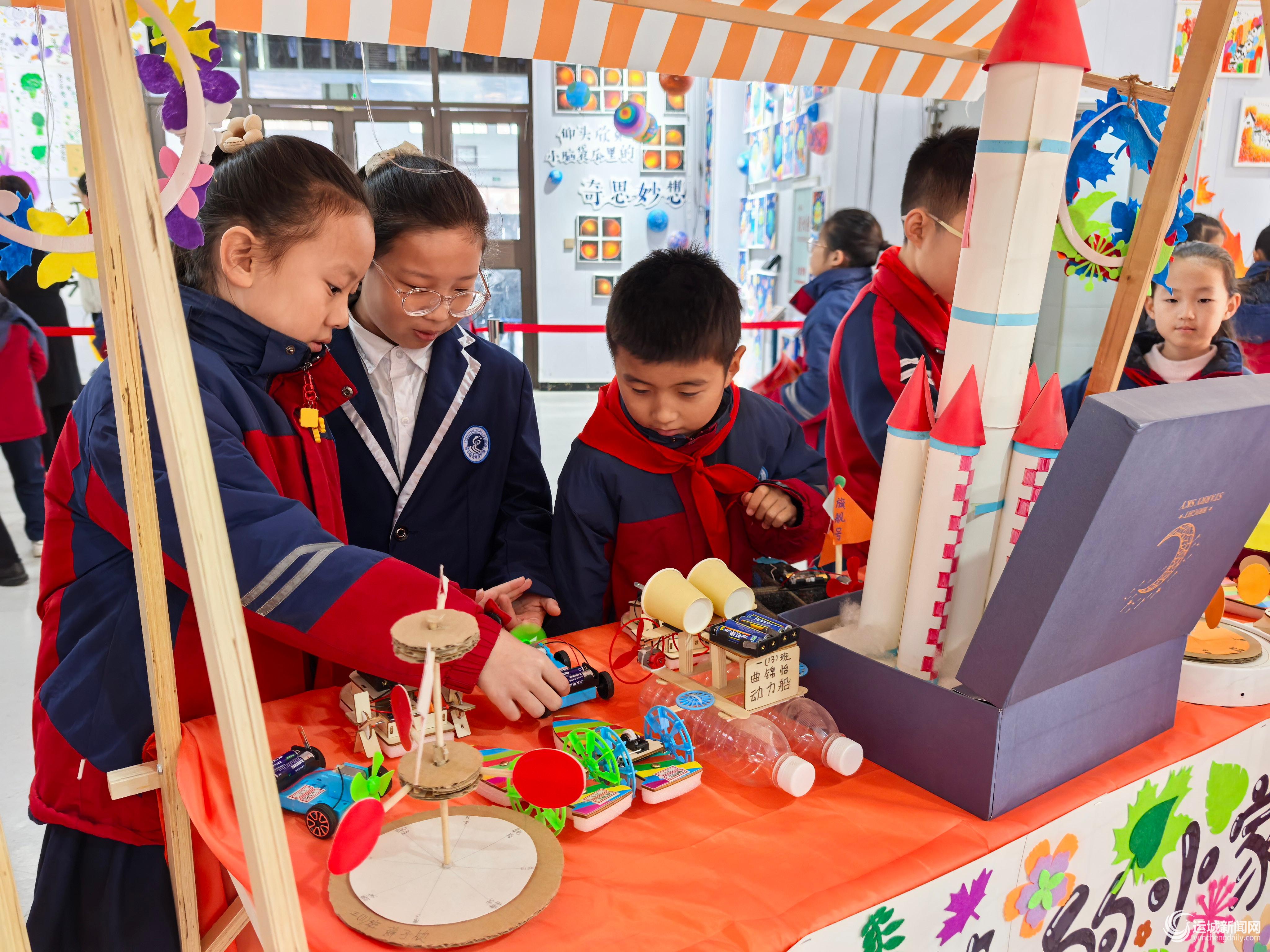 “画画并不局限于纸和笔。”灵动的纸艺花、逼真的“年夜饭”手工、冲击力拉满的装饰画……纵观整个画展,孩子们发挥想象力和创造力,描摹生活、定格快乐,进一步提高了绘画能力和艺术审美。“我们鼓励孩子在袋子上作画、用落叶作画,利用身边的、可利用的一切材料,去发现美、感知美、创造美。”薛富栋说。