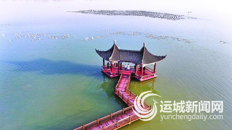 1月14日,芮城县圣天湖国家级湿地保护区云雾缭绕,湖面澄澈,成群天鹅等水鸟悠然游弋,勾勒出一幅灵动绝美的冬日水墨画卷,吸引众多游客与摄影爱好者前来定格这份限定美景。 特约摄影 张怀心