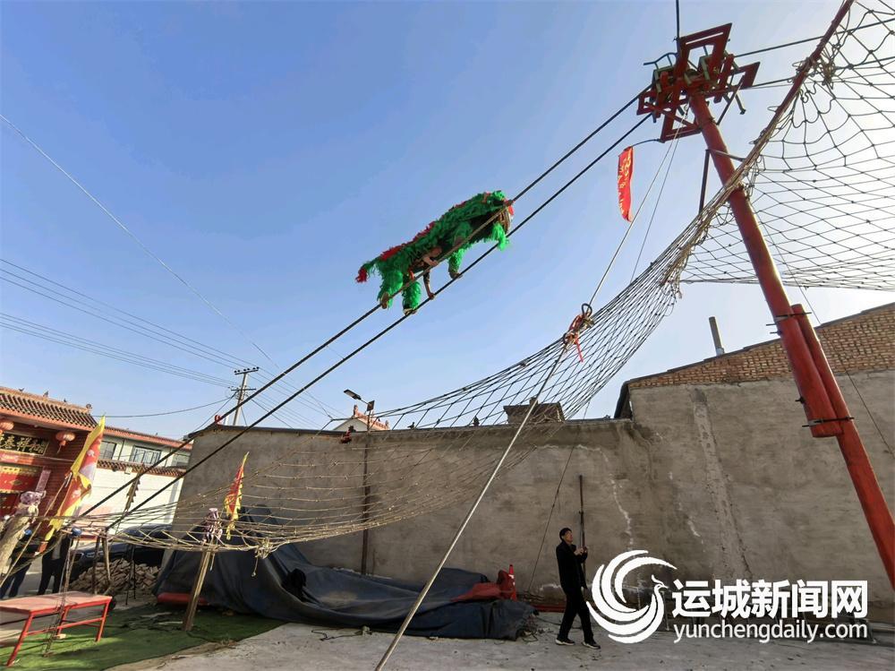锣鼓铿锵,穿透冬日永济市虞乡镇土乐村的上空。院落里,几抹红黄翠绿身影闻声而动,头戴威武狮头的表演者们躬身蓄力,踩着鼓点纵身一跃,稳稳攀上凌空细绳。