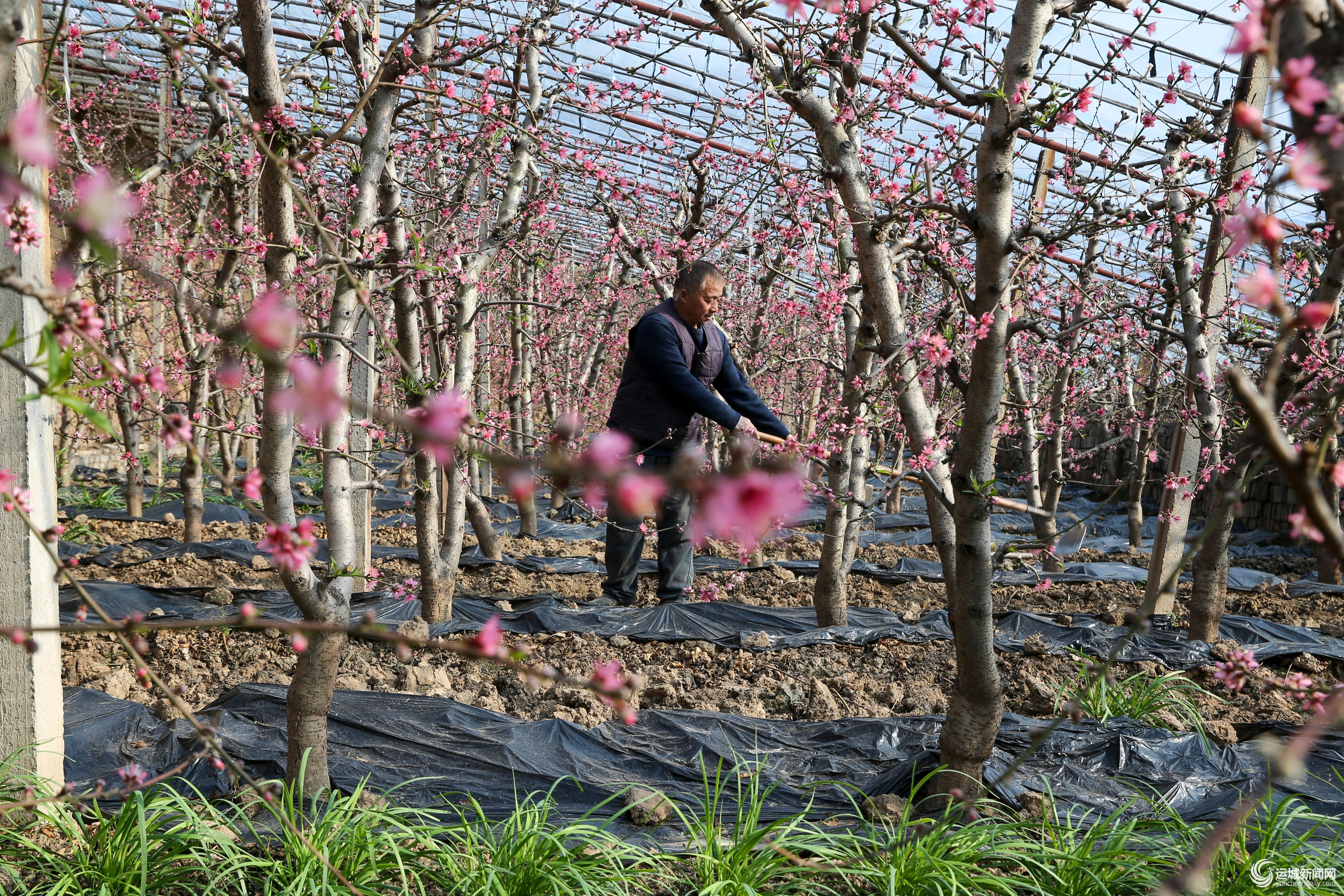 1月17日,桃农在新绛县阳王镇上庄村桃树大棚内进行管护作业。