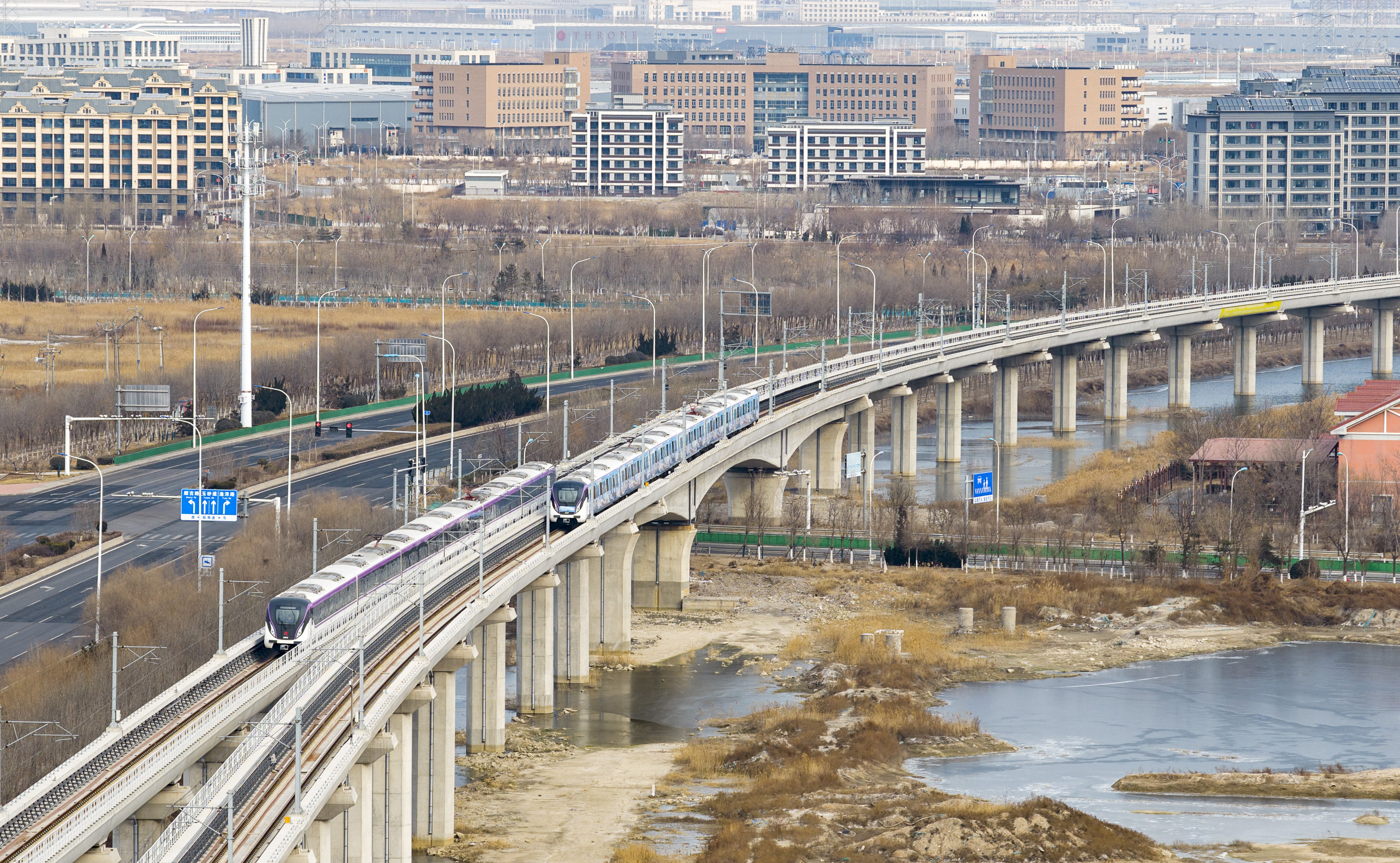 1月18日,列车行驶在天津市轨道交通Z4线上(无人机照片)。当日,该线一期(北段)正式开通运营。
