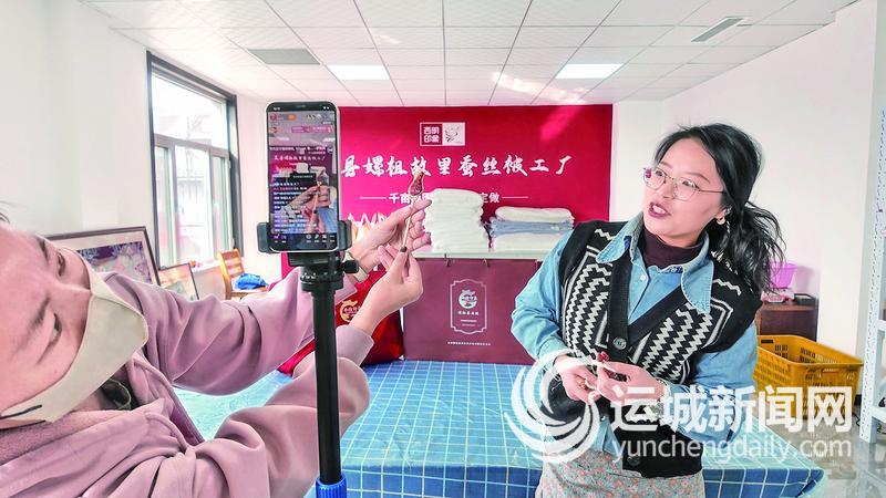 近日,在山西嫘祖故里农业开发有限责任公司,工作人员在进行直播带货。