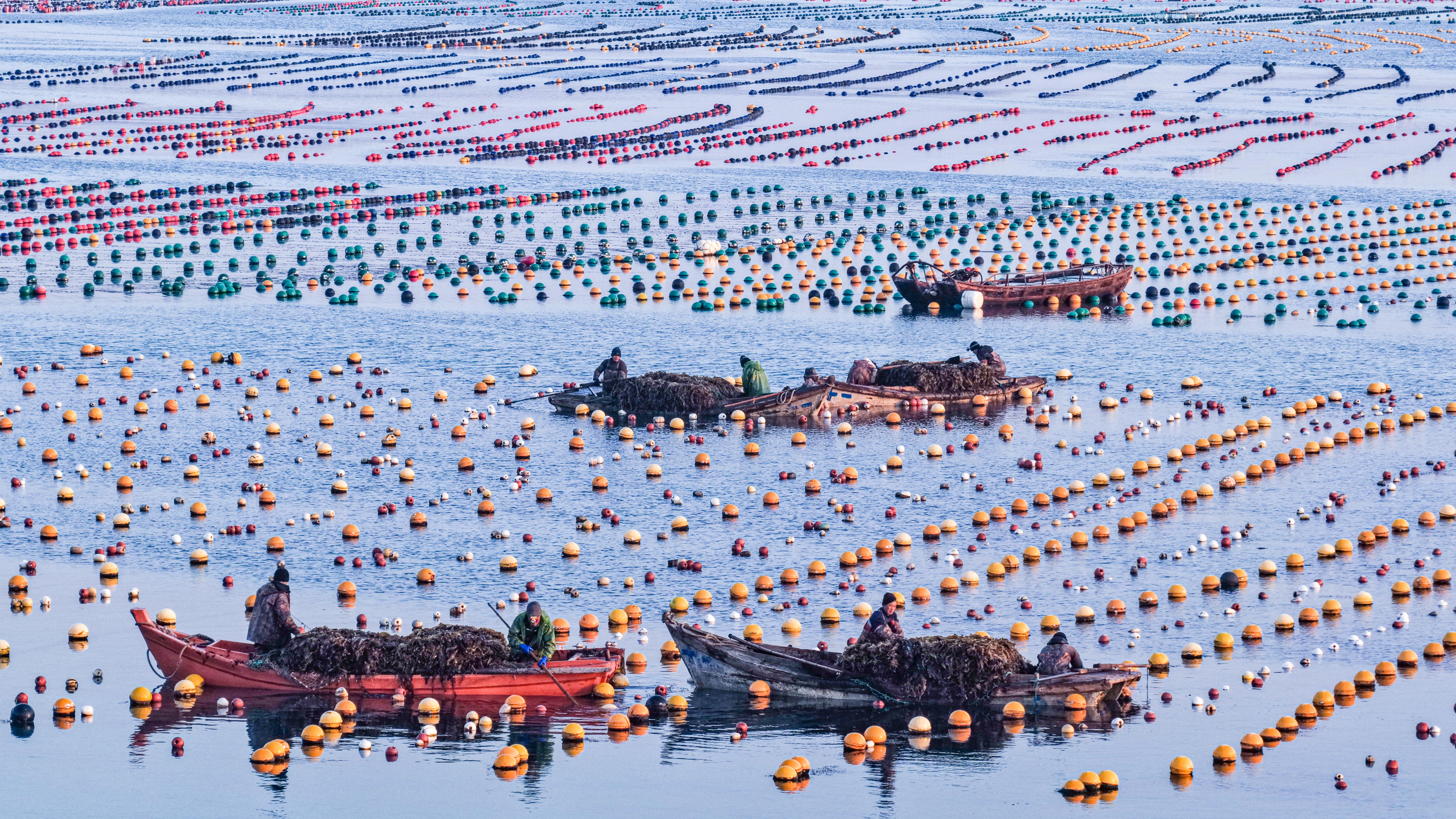 眼下,山东省荣成市小海带迎来收获季,养殖工人忙碌收获,投放春节市场。