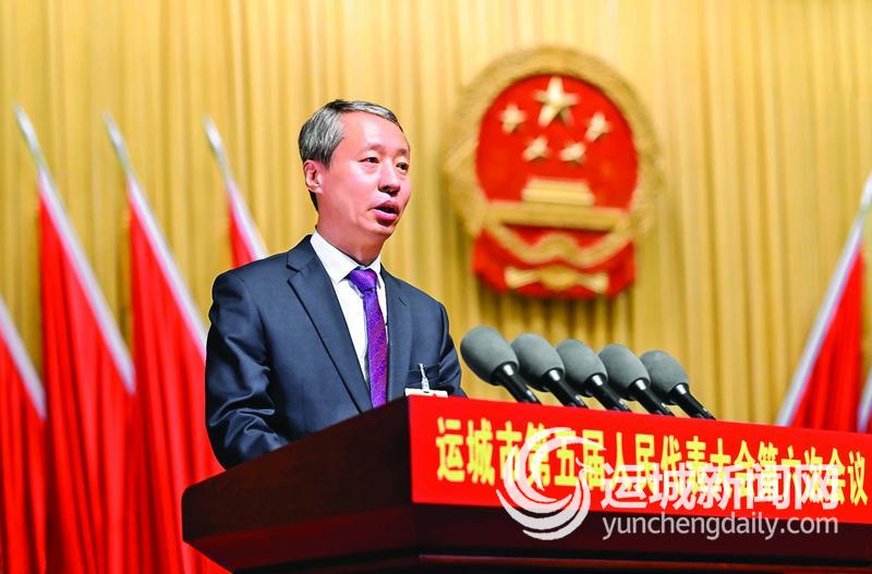 1月15日,在运城市第五届人民代表大会第六次会议上,那志茂作市人大常委会工作报告。 本报记者 闫 鑫 摄