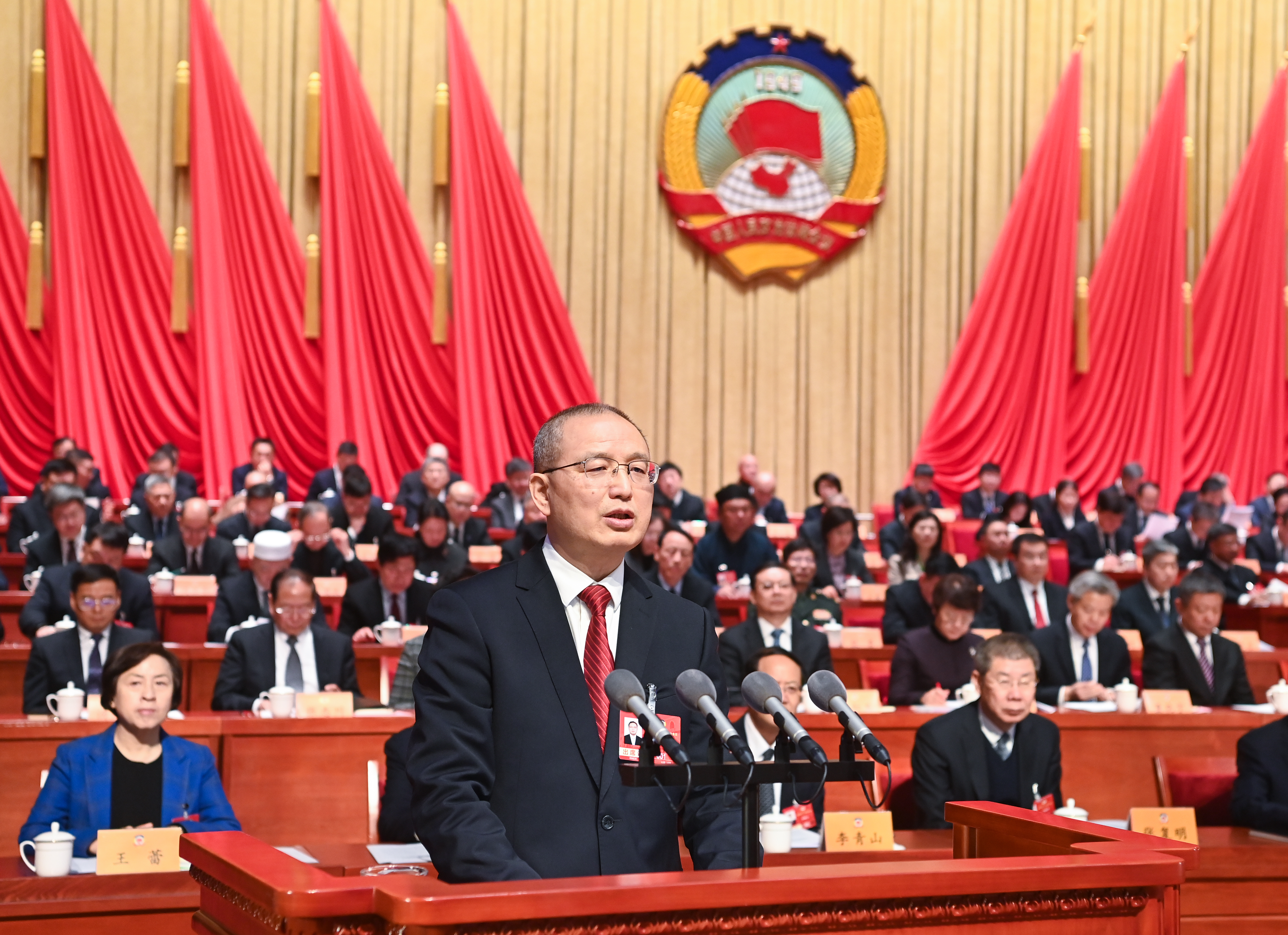 在主席台就座的还有王拥军、李金科、董晓宇、汪海洲、胡立杰、张碧涌、林红玉、罗清宇、李凤岐、贺天才、谢红、王纯、张志川、吴俊清、汤志平、杨勤荣、张韶华、景普秋、朱晓东、冯军、熊文辉、殷勇、张永强,在晋省委原书记王儒林、骆惠宁,省政协原主席薛延忠,十二届省政协副主席张瑞鹏、席小军、李武章,省人大常委会秘书长郭海刚、省政府秘书长李秋柱和省政协常委。
