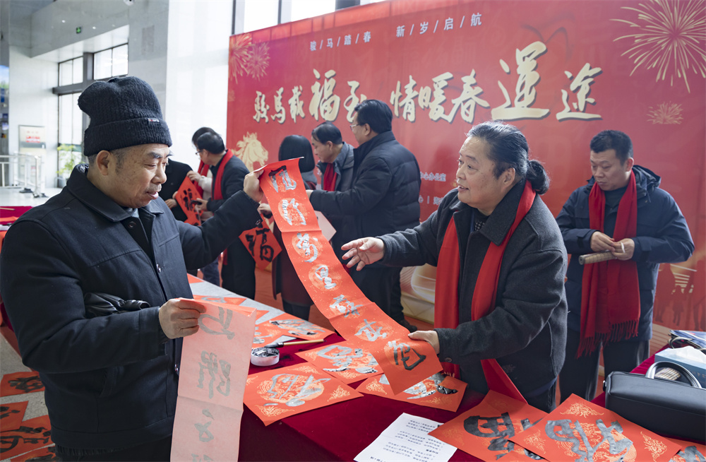 春运大幕拉开,江苏海安站开展“骏马载福至 情暖春运途”温暖回家路主题活动,邀请海安本地文化志愿者现场挥毫泼墨、书写春联福字。车站工作人员将饱含新春美好祝愿的墨宝送到旅客手中,让浓浓墨香浸润旅途,用暖心服务为归乡游子送上新春祝福。新华社发(向中林 摄)