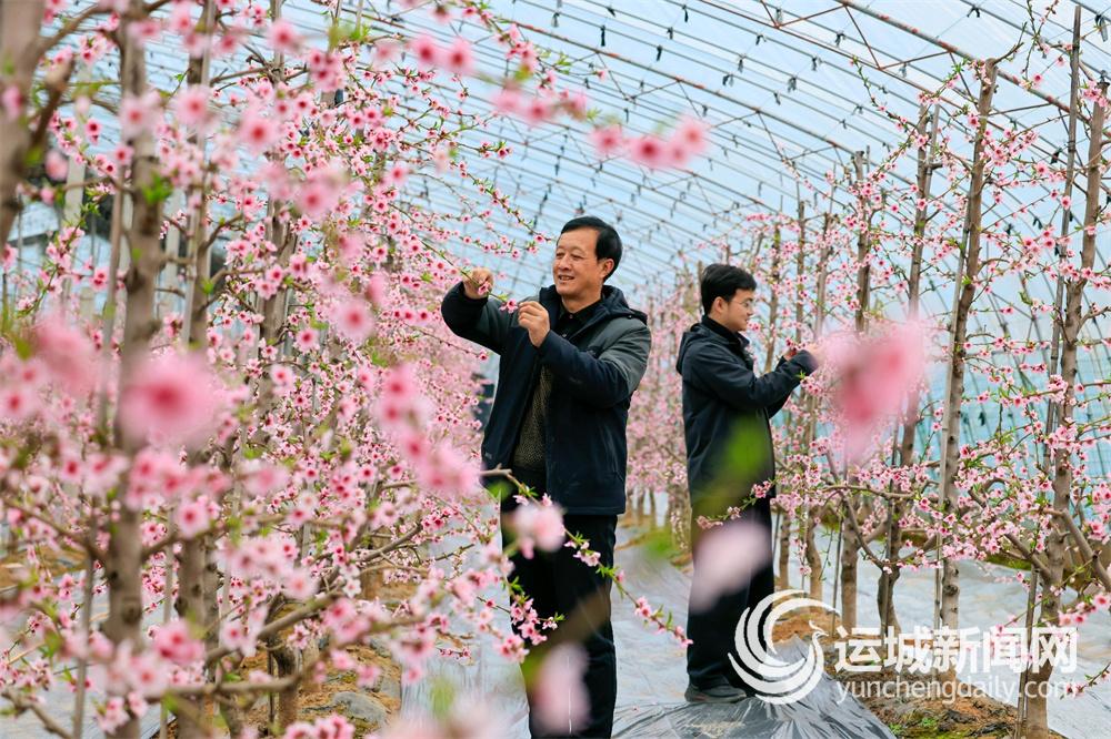 2月3日,万荣县通化镇西孝原村大棚桃花盛开,桃农忙着管护桃树,为今年实现丰产丰收打好基础。